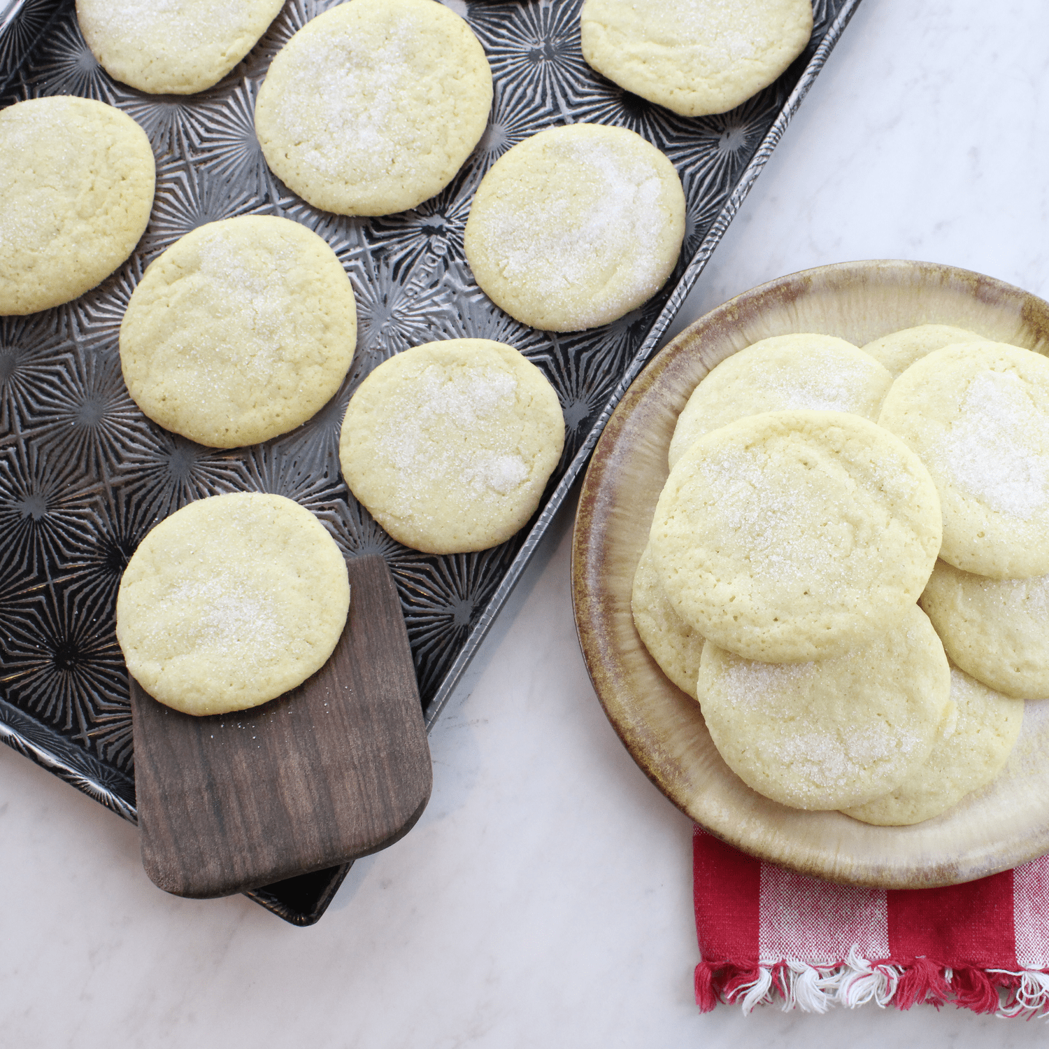 - On a well-floured surface, roll out a portion of the dough to ¼ inch thick. Cut with a biscuit cutter or round cutter. Using a spatula, gently lift the cut cookie and place on a parchment lined baking sheet, allowing 2 inches between cookies. Sprinkle additional white sugar on top of each cookie. Bake for 12-14 minutes in a conventional oven or 8-9 minutes in a convection oven. Allow to cool on the baking sheet for 10 minutes or until cookies begin to set. Move to a wire cooling rack until completely cooled. Store in an airtight container for up to 1 week.