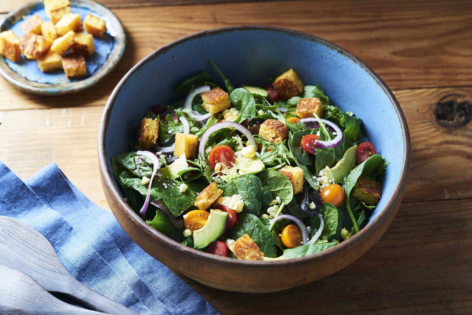 - Place the spinach or arugula in a large salad bowl. Spoon the corn mixture over the top, and add the sliced tomatoes and avocado. Season the top with salad and pepper to taste. Drizzle on your favorite vinaigrette. Garnish the top of the salad with the cornbread croutons, feta, and basil. Toss and serve.