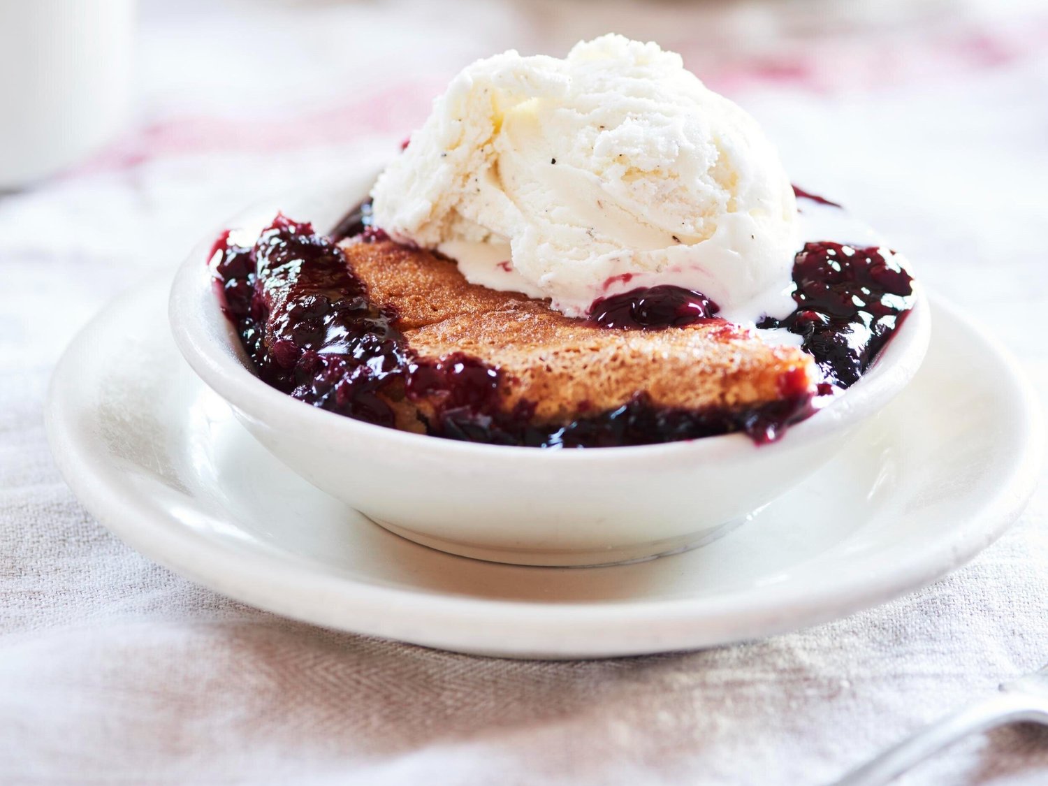 - Bake until the top has lightly browned, and the blackberries are bubbling in the center, about 15 to 20 minutes. Remove the dish from the oven, and let it cool 10 minutes. Spoon into bowls and serve warm with ice cream.