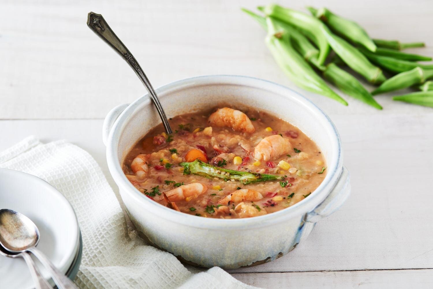 Part gumbo, part chowder. All easy. This soup begins with our signature corn chowder mix and you add the goodies like okra, shrimp, and crab. It’s perfect for large gatherings, special occasions, and it all begins with a package of soup mix!