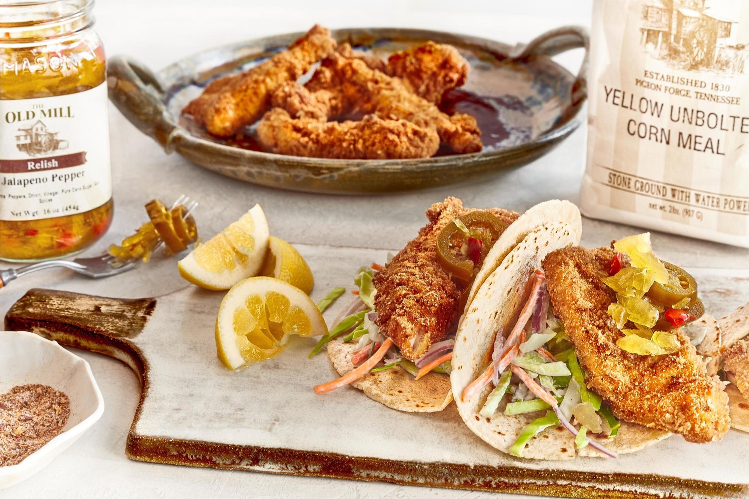 Strips of catfish are soaked in buttermilk spiked with The Old Mill’s fiery Devil’s Backbone seasoning, rolled in freshly ground cornmeal, and quick-fried to a golden crunch. Then they’re folded into a warm tortilla with a spoonful of tangy coleslaw.