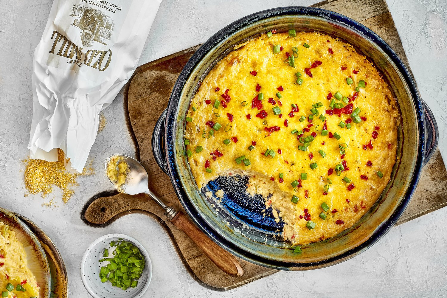 - Bake until the grits are cooked through and golden brown, about 45 to 50 minutes. Remove the pan from the oven, and garnish with the green onion and bacon, if desired.
