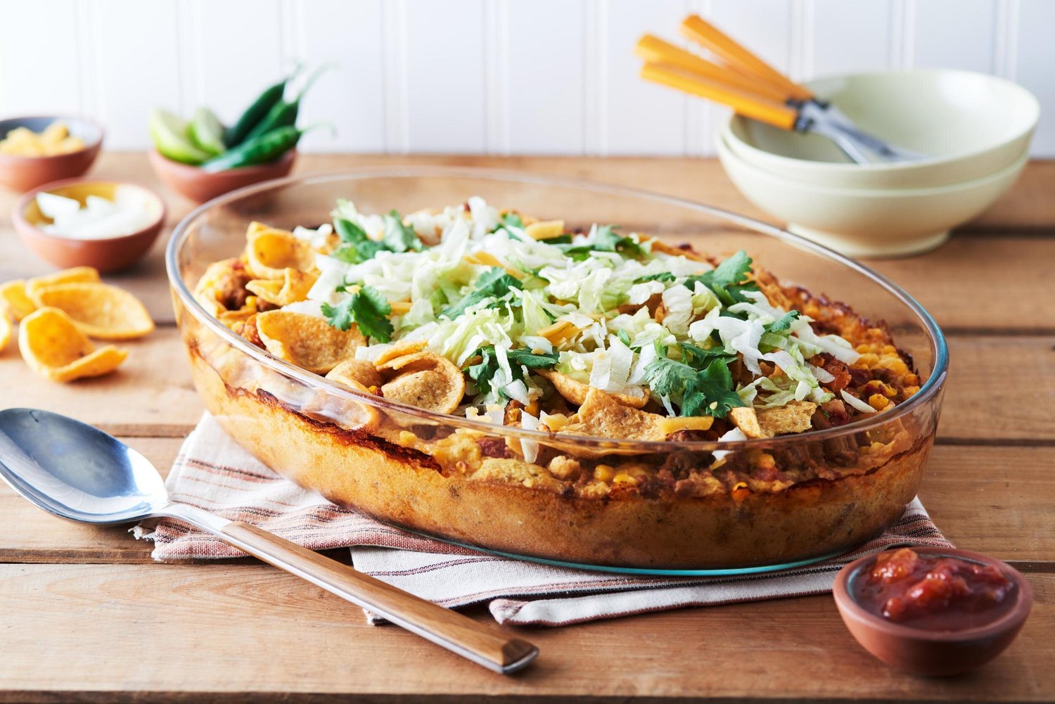 - Bake until the cornbread is cooked through and the casserole is bubbly, about 50 to 50 minutes. The baking time will differ depending on your casserole dish. When the cornbread tests done, remove the casserole from the oven, and scatter the top with the remaining cheese. Place the casserole back in the oven to let the cheese melt, about 3 minutes. Remove the casserole from the oven, and garnish with salsa, lettuce, tomato, and cilantro. Serve at once.