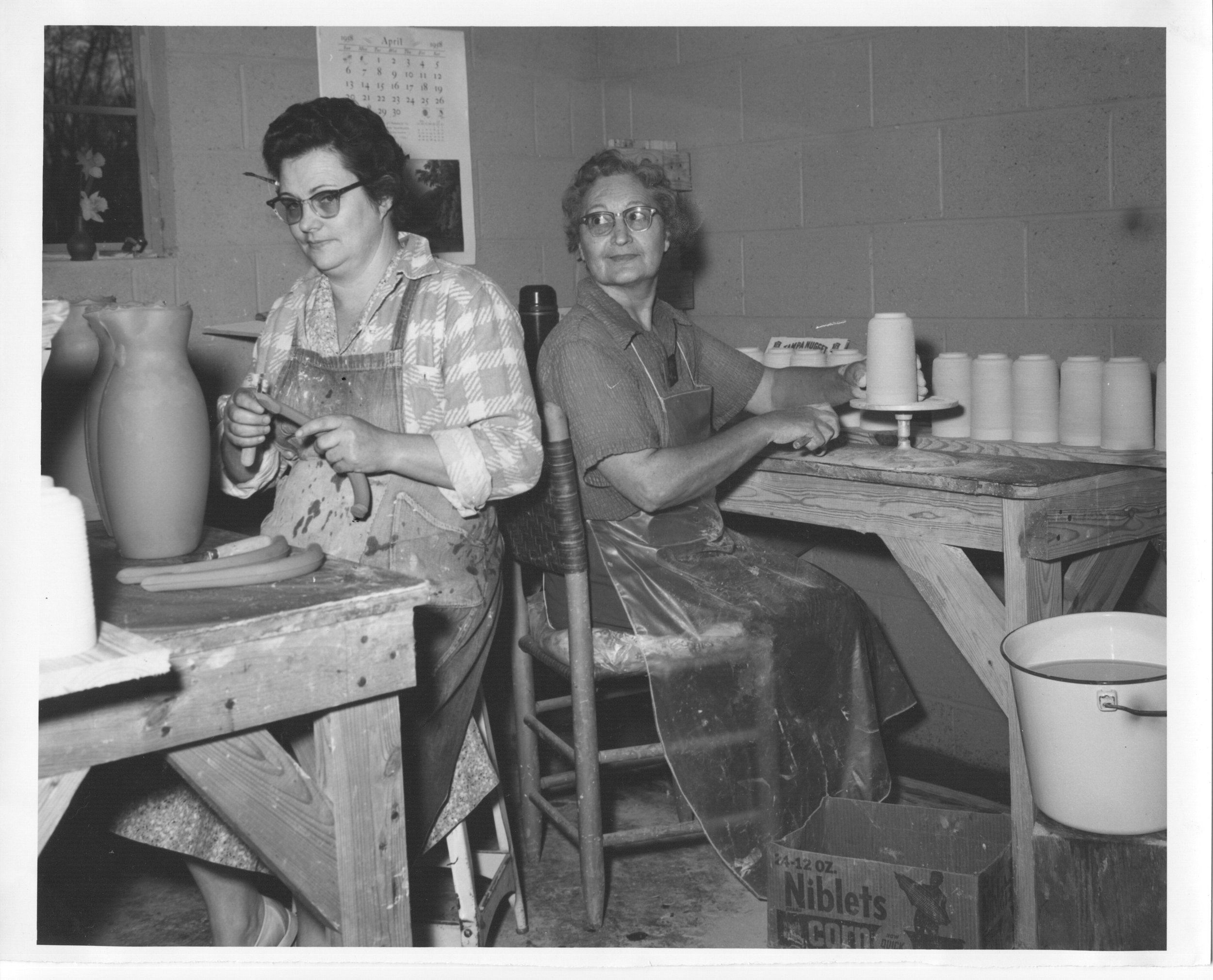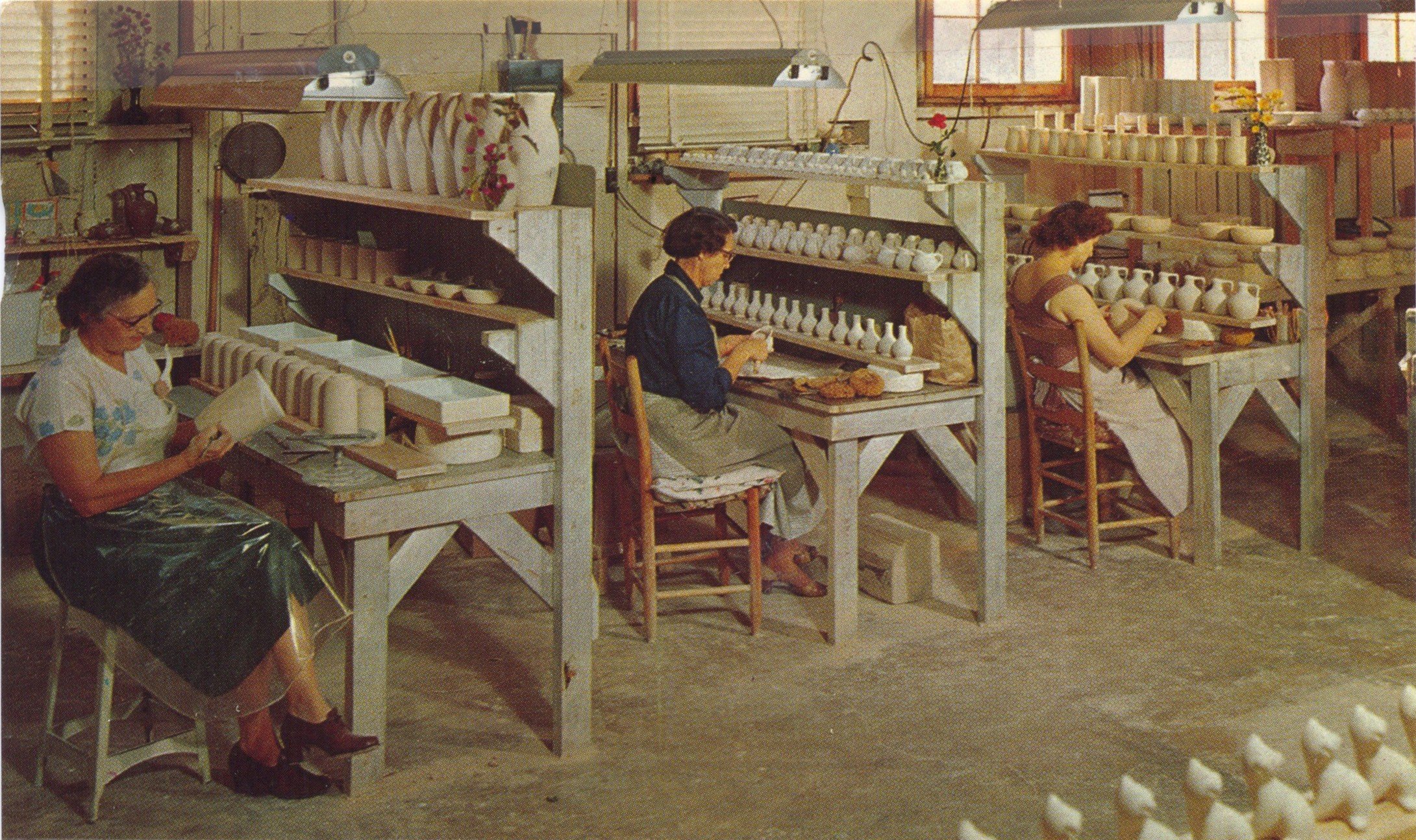 Inside the studio, it was a mostly female staff that Mr. Ferguson employed to clean, paint, and glaze the pottery he sold on the sales floor. When he passed away in 1999, his family decided to let us purchase the building, but not the business. With the help of a few of the employees that came back to work for us, we opened our first business across from the mill. One of those employees was Doris, who was a thrower and would demonstrate on the wheel for guests as she worked. Another was Pearl who cleaned pottery. She did this for 46 years before retiring. Today, our pottery production staff is rarely less than 50% female.