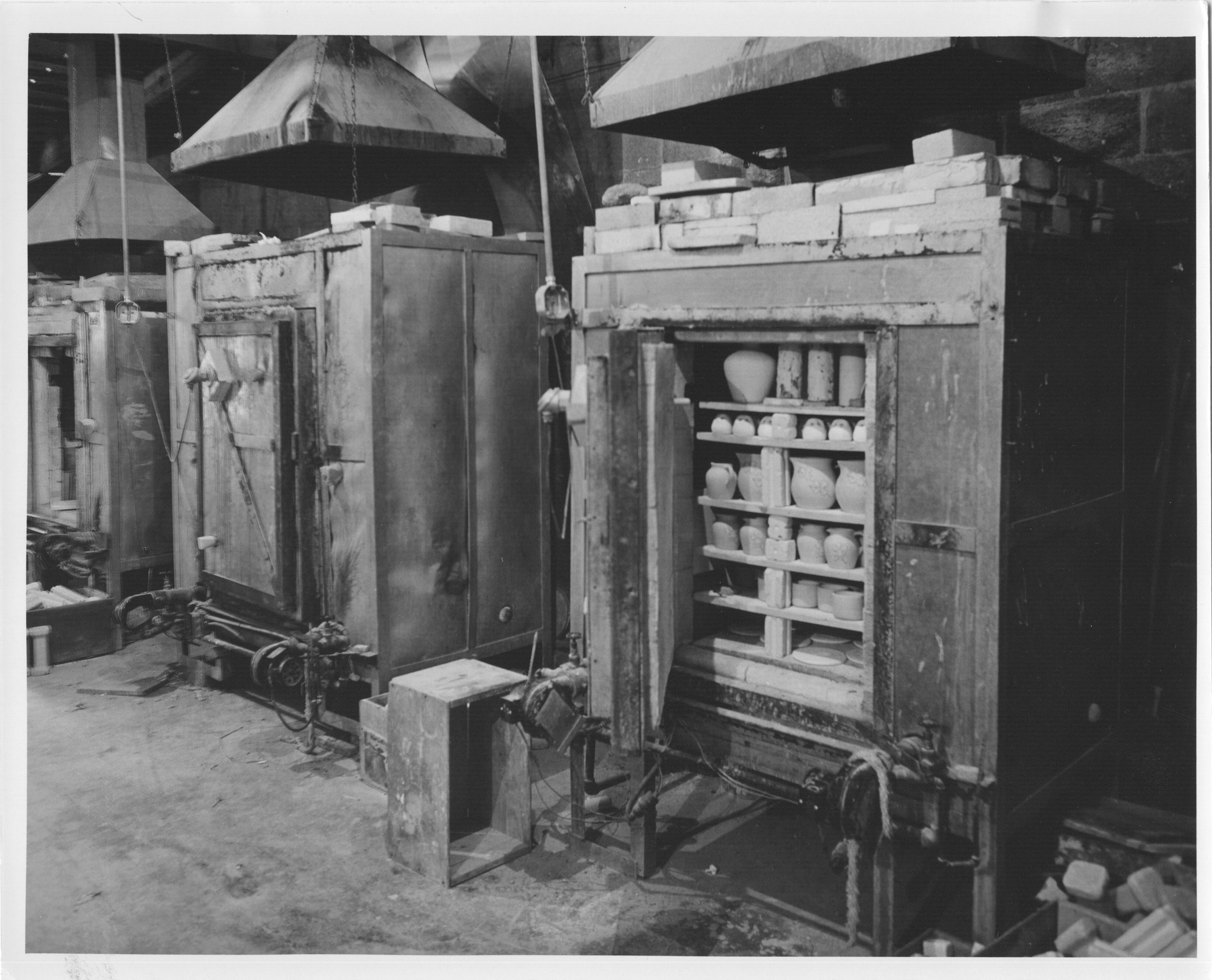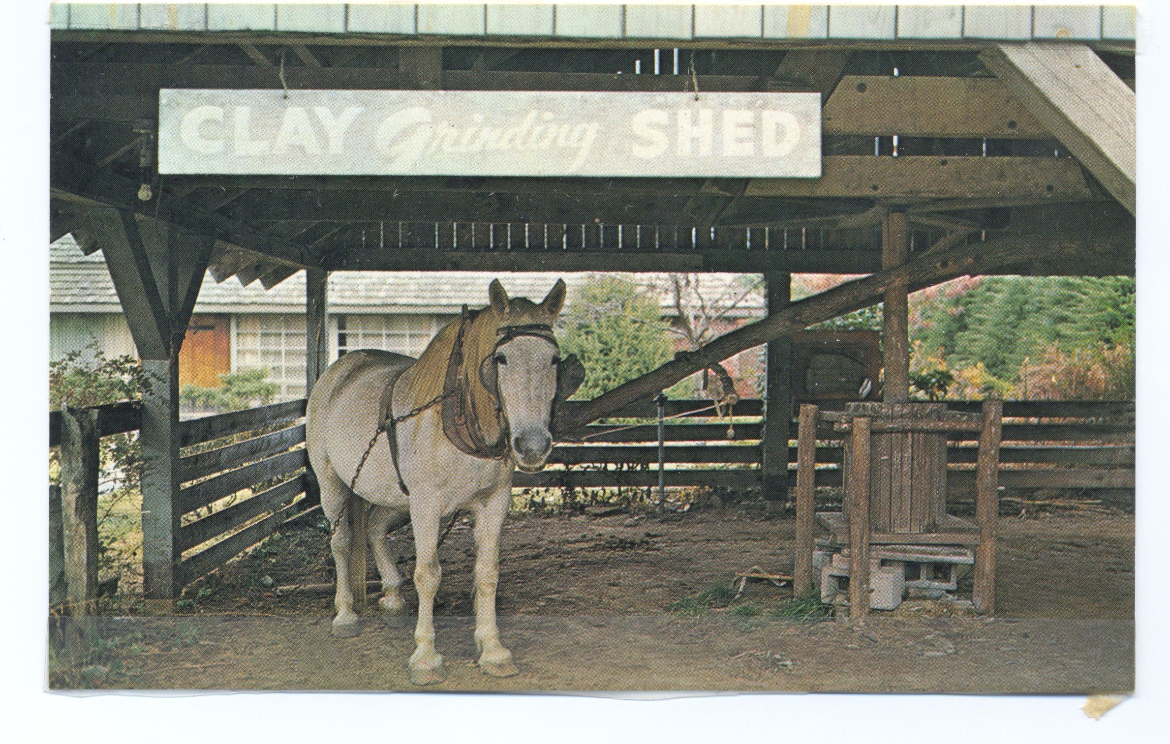 At one time there was a horse that he’d purchased to pug the clay in a shed outside the studio. They named him Cyclone Jim because he walked in a circle, around a vat that the clay was tossed into. As he made his rounds, he pulled the gears to the pug machine, and it would clean the clay by passing it through a series of screens. This would remove any pebbles, sticks, and any objects so the potters would have smooth clay to throw with.