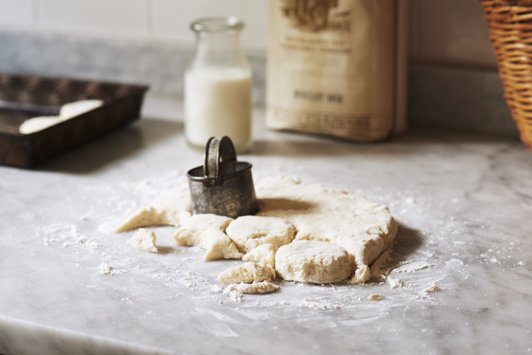 - Place the extra 1/4 cup flour on a work surface. Dump the biscuit dough on top of the flour, and with floured hands work it gently into the dough, patting it out to 1-inch, folding one side over like closing a book. Pat out and fold one more time. Then pat out to 1-inch thickness. Flour a 2-inch cutter and push straight down to cut 12 biscuits.