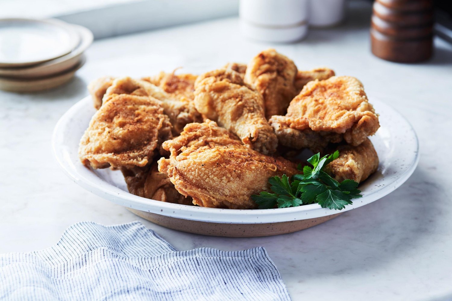 Old-time tradition meets modern convenience in this fried chicken recipe. You first brown the chicken in oil until golden and crispy. Then cook to doneness in the oven so you can finish preparing the rest of the meal.
