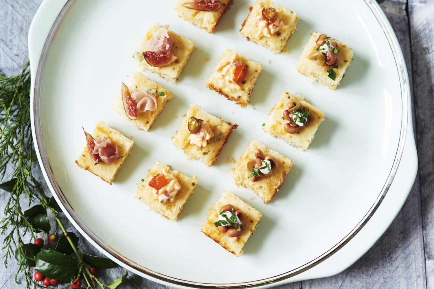 - When ready to assemble, cut the cornbread into about 54 squares. Remove the squares to a large tray or sheet pan. Top some of the squares with a teaspoon of black eyed pea relish and the others with a teaspoon of pimento cheese. Top the pimento cheese-covered squares with a dab of pepper jelly, if desired, or candied pepper slices. Top the rest with thinly sliced ham or prosciutto rolled up into a little rose alongside a thin slice of fig. Arrange on a platter and serve at room temperature.