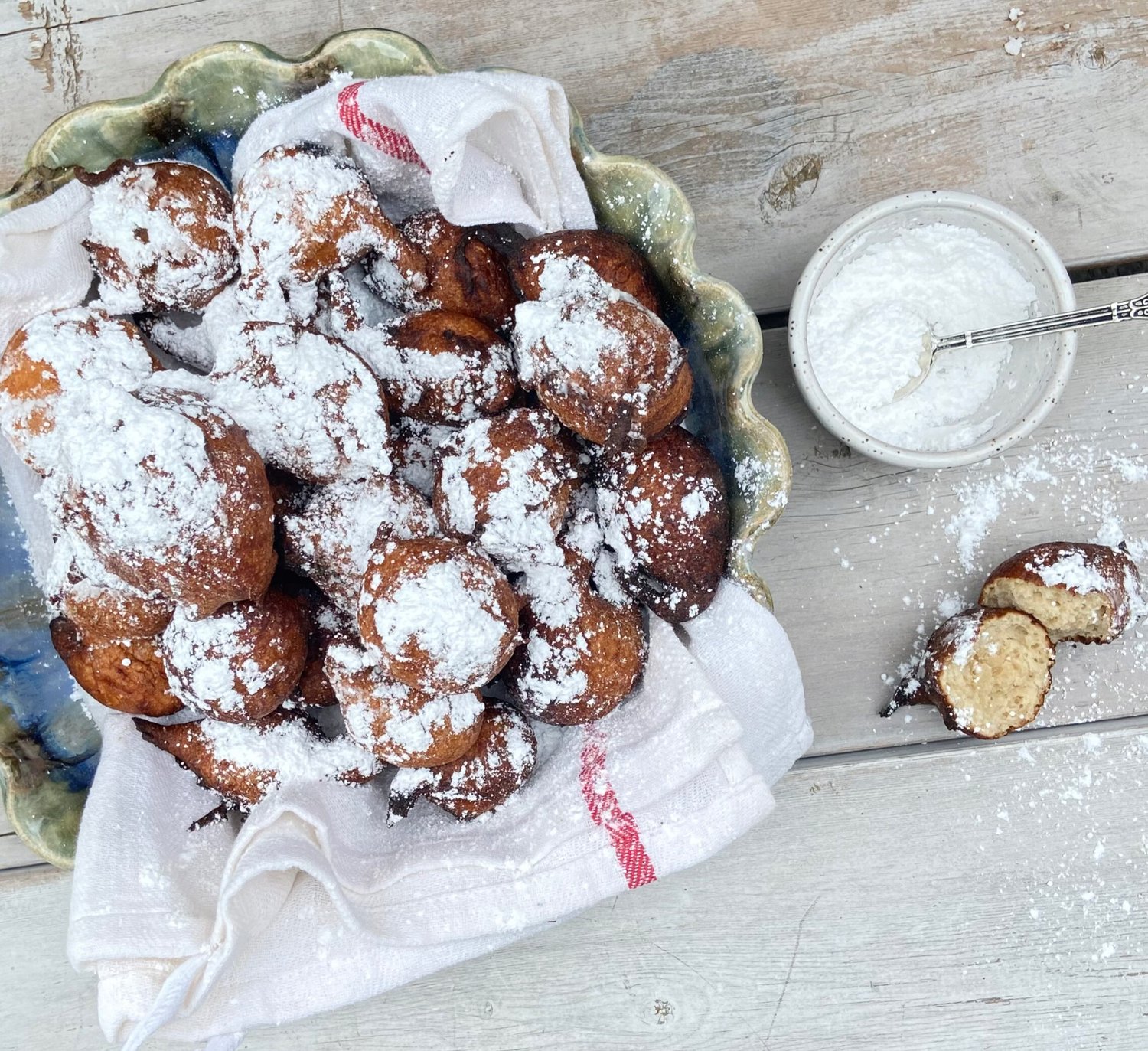 Mix one cup of rye flour, a half cup of white flour, a pinch of salt, one and a half teaspoons of baking powder, and a half cup of sugar. Moisten with one cup of milk and one beaten egg into a stiff batter. Heat a skillet with several inches of lard, drop the batter in by spoonful and cook for about six minutes or until the balls are golden brown. Drain and sprinkle with powdered sugar.