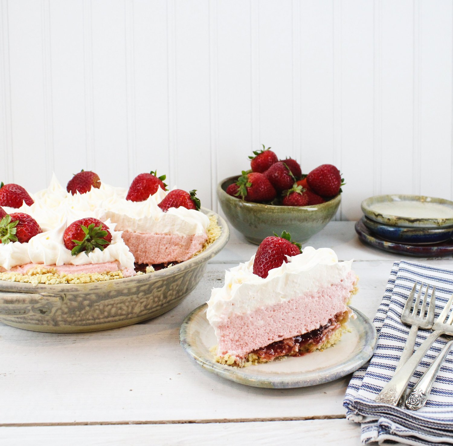 This Strawberry Chiffon Saltine Pie recipe is light, fluffy, and packed with fresh strawberry flavor. The salty crackers in the crust and light strawberry filling are a perfect match!