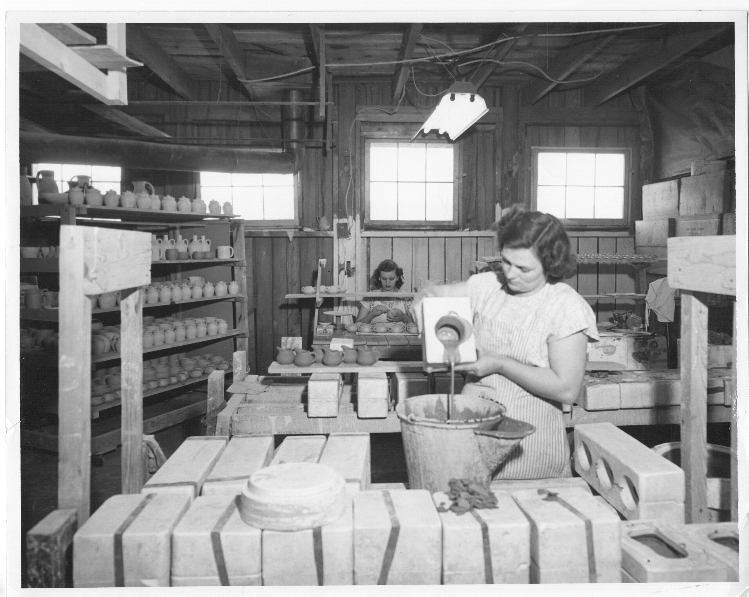 Inside the studio, it was a mostly female staff that Mr. Ferguson employed to clean, paint, and glaze the pottery he sold on the sales floor. When he passed away in 1999, his family decided to let us purchase the building, but not the business. With the help of a few of the employees that came back to work for us, we opened our first business across from the mill. One of those employees was Doris, who was a thrower and would demonstrate on the wheel for guests as she worked. Another was Pearl who cleaned pottery. She did this for 46 years before retiring. Today, our pottery production staff is rarely less than 50% female.